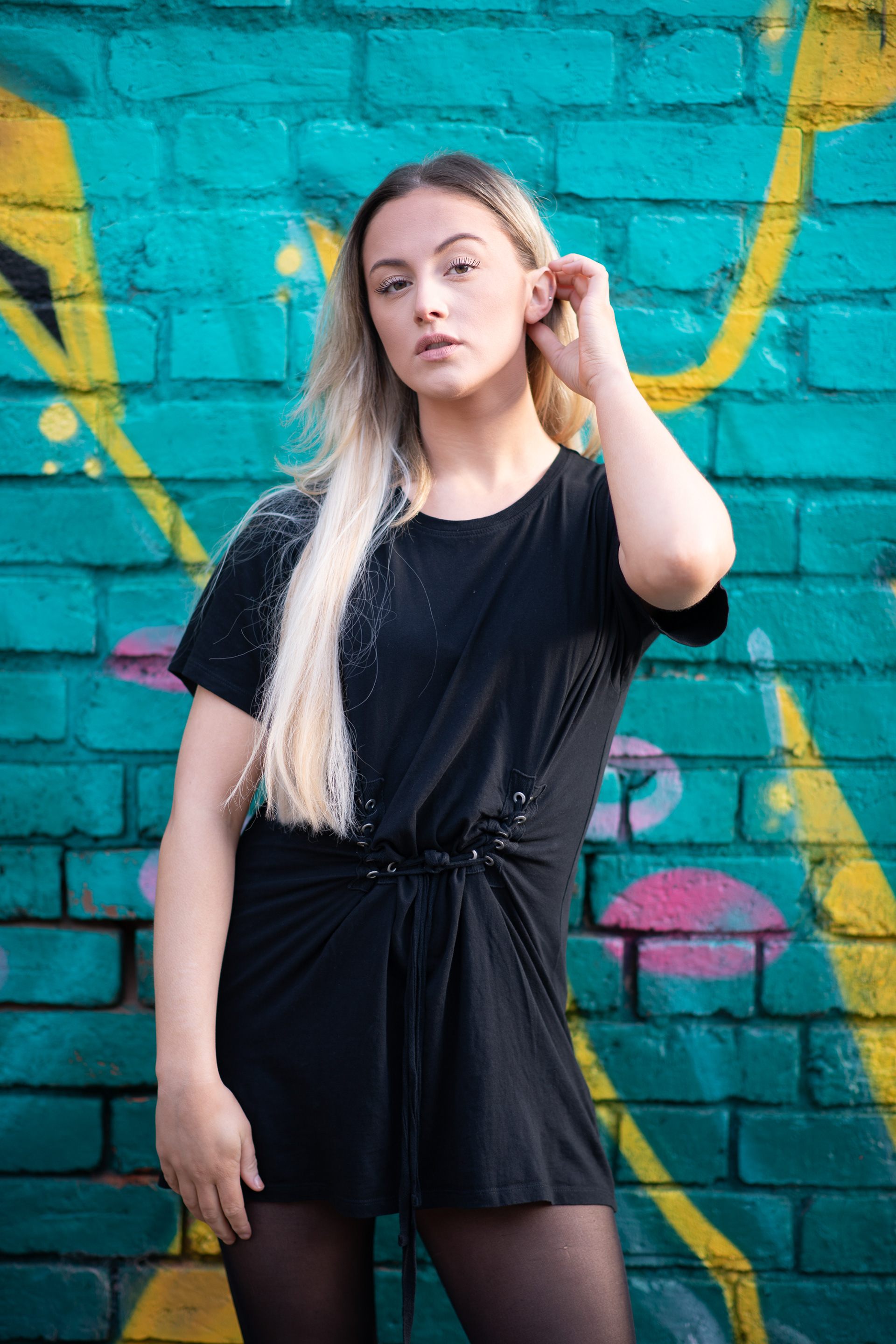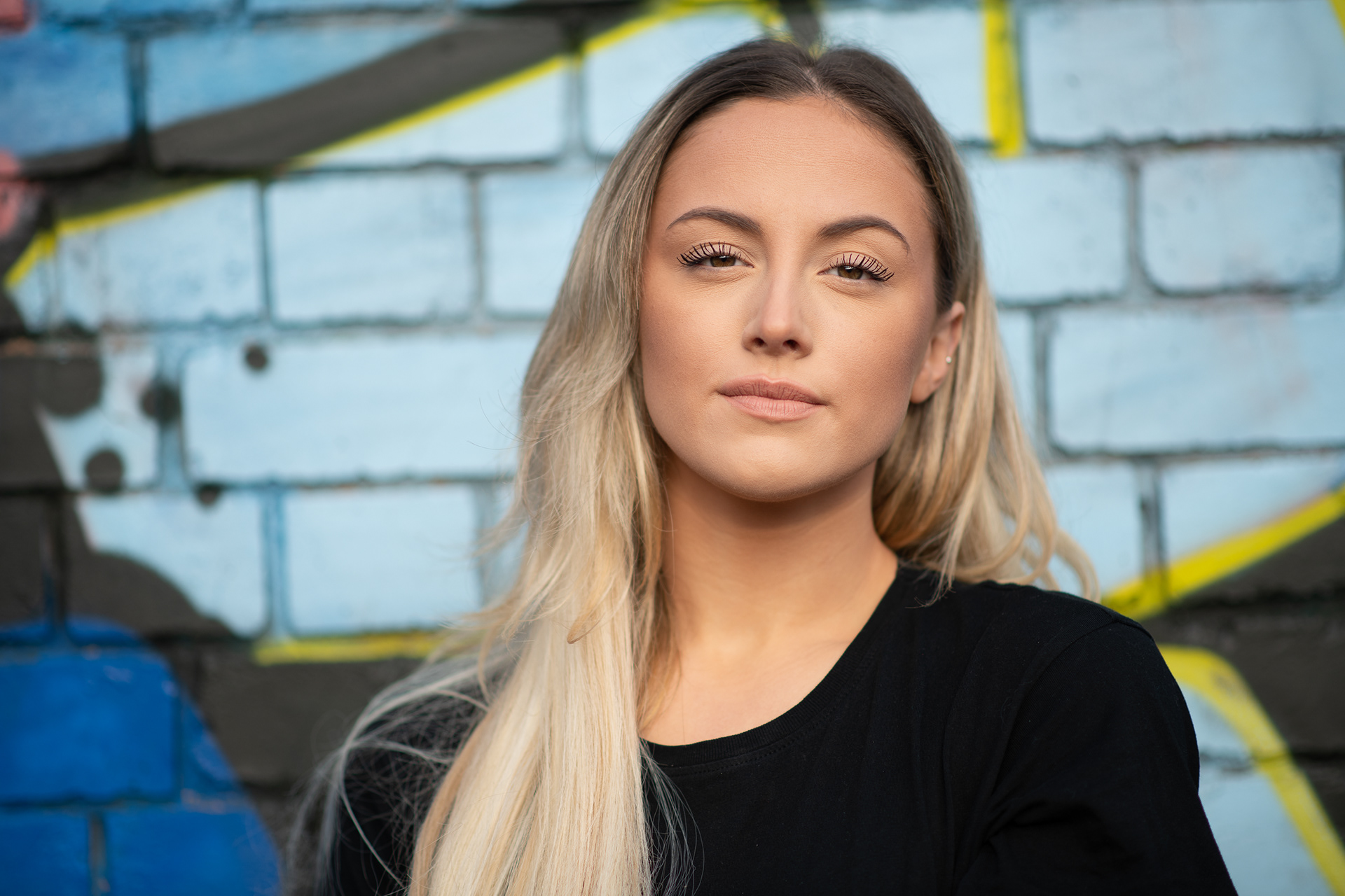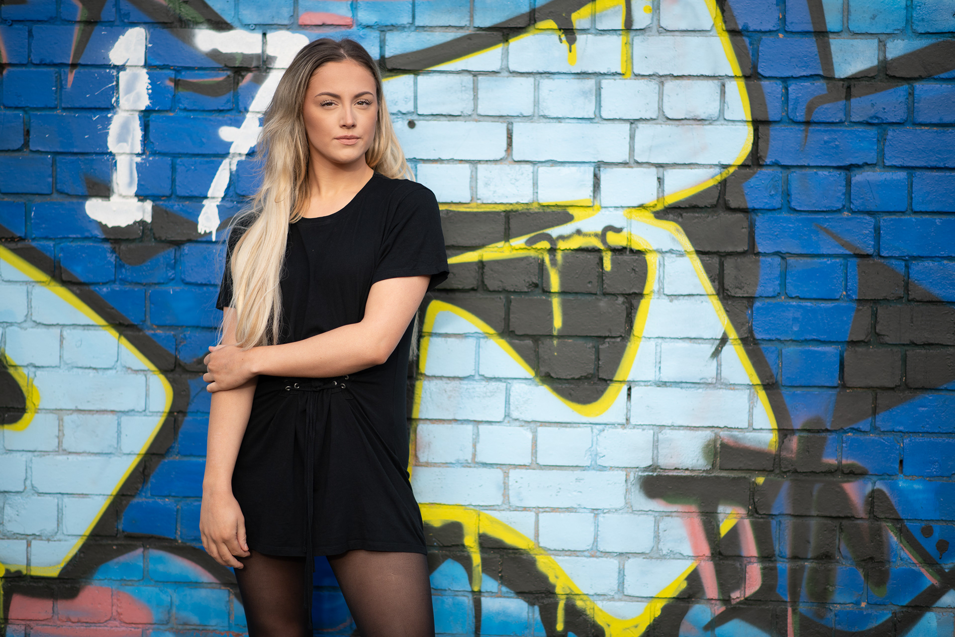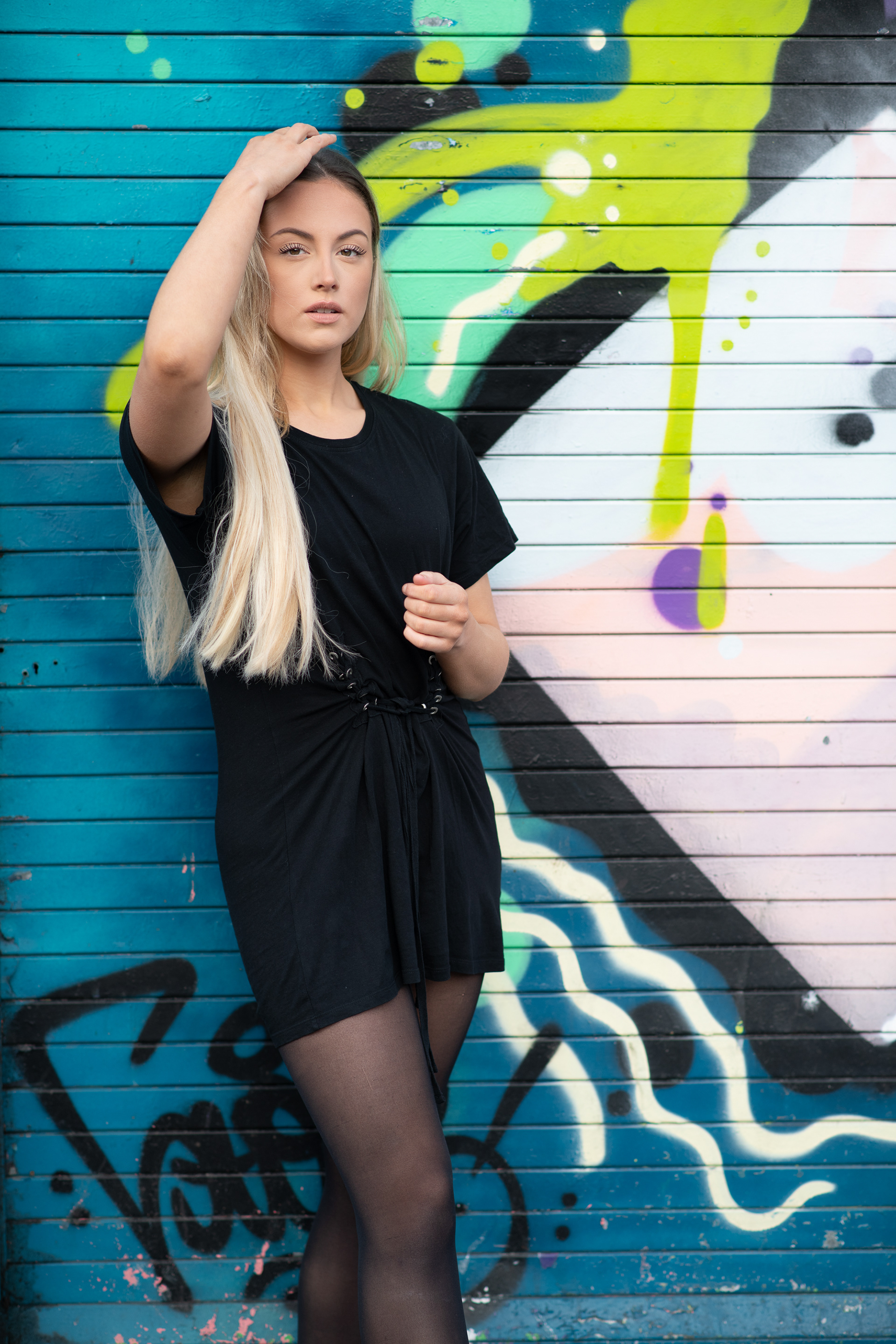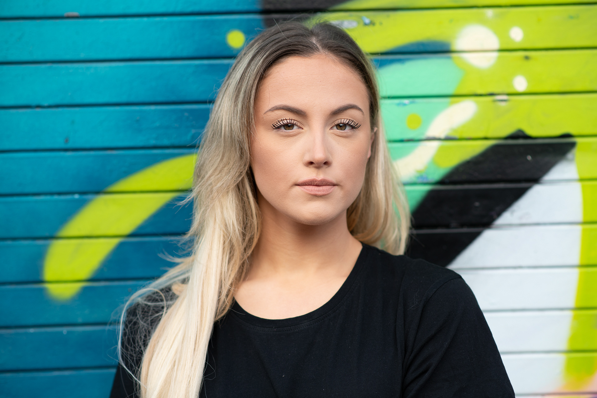 Street portraits with Victoria with the graffitied walls of Leicester Cultural Quarters as the background