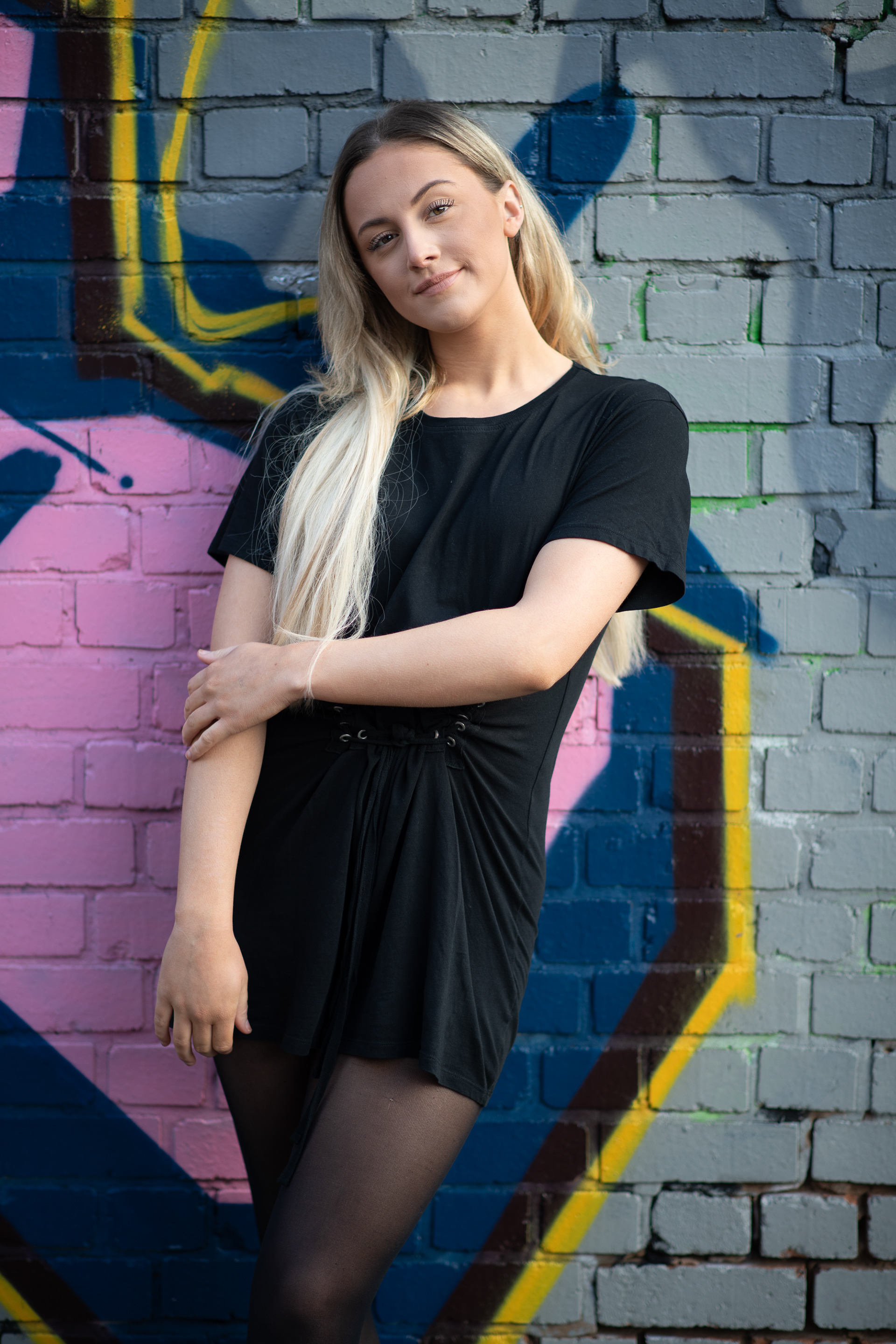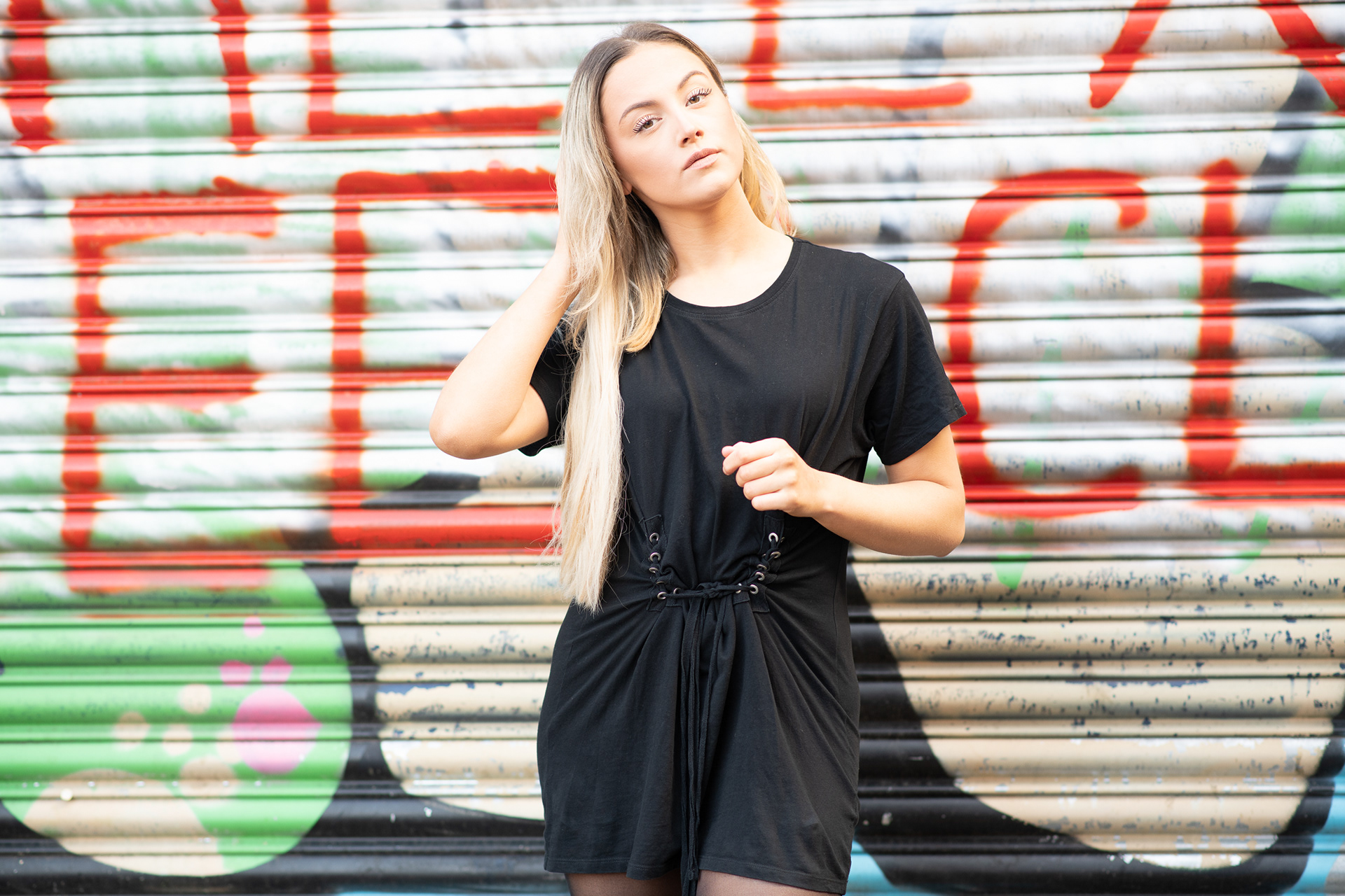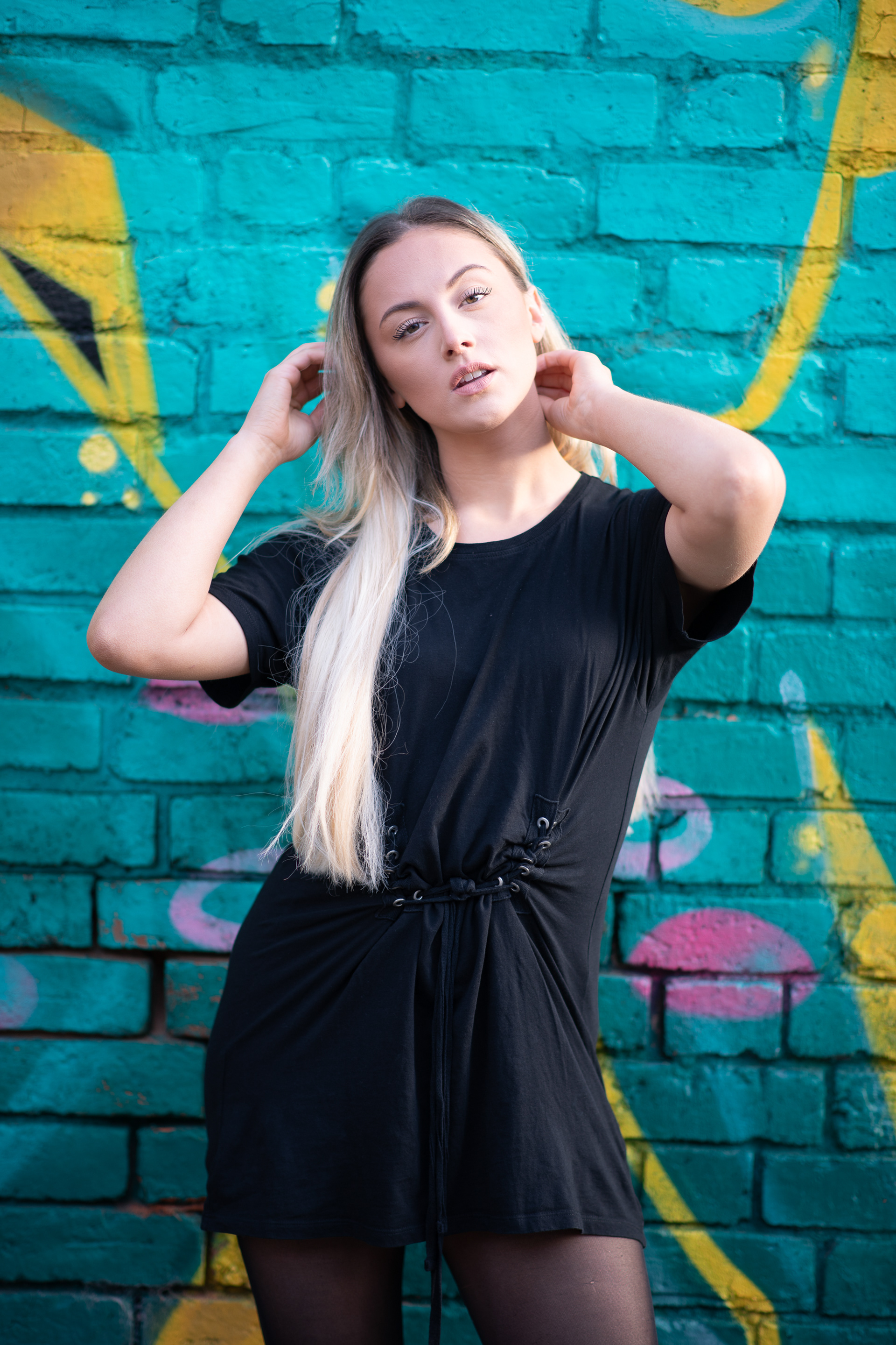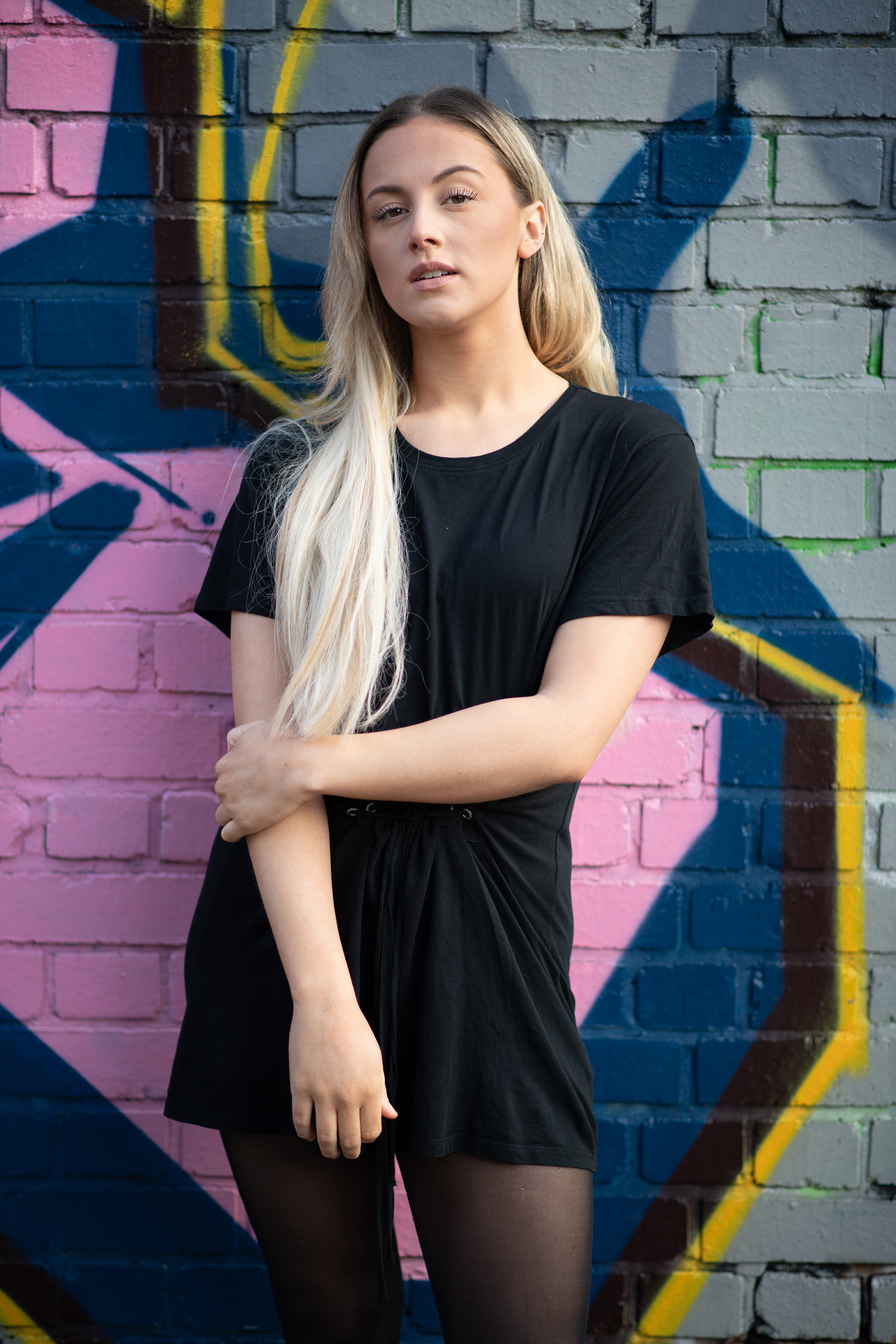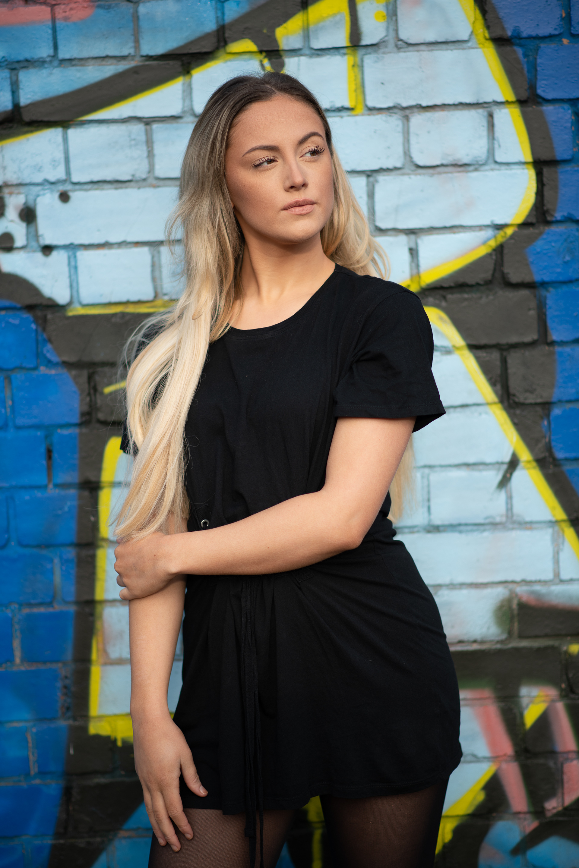 Street portraits with Victoria with the graffitied walls of Leicester Cultural Quarters as the background