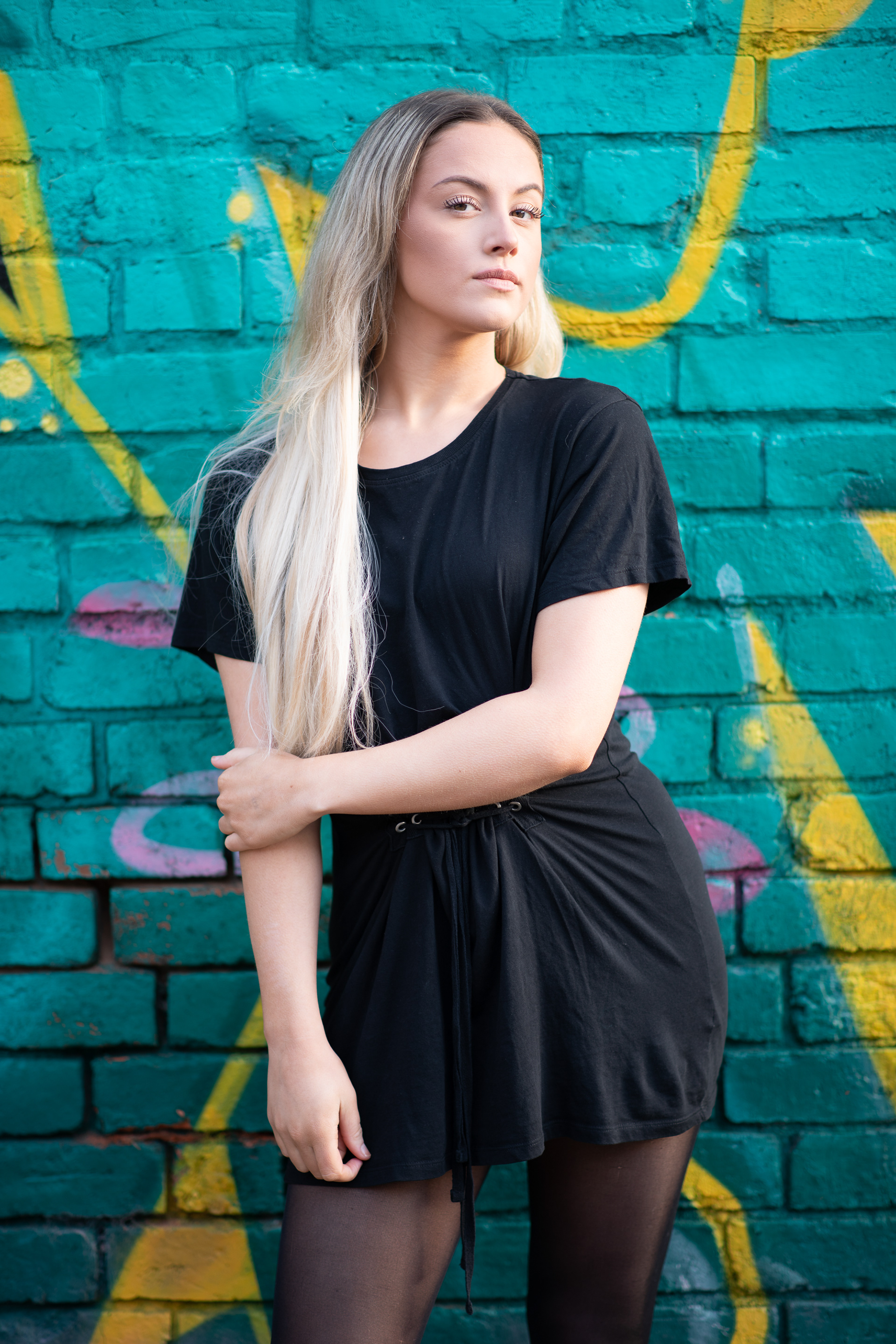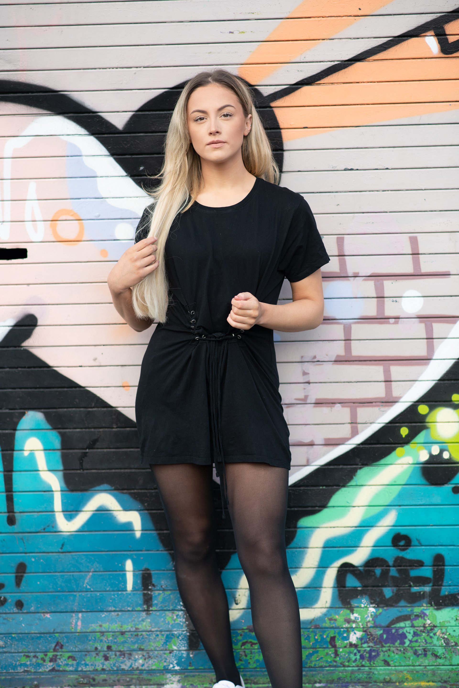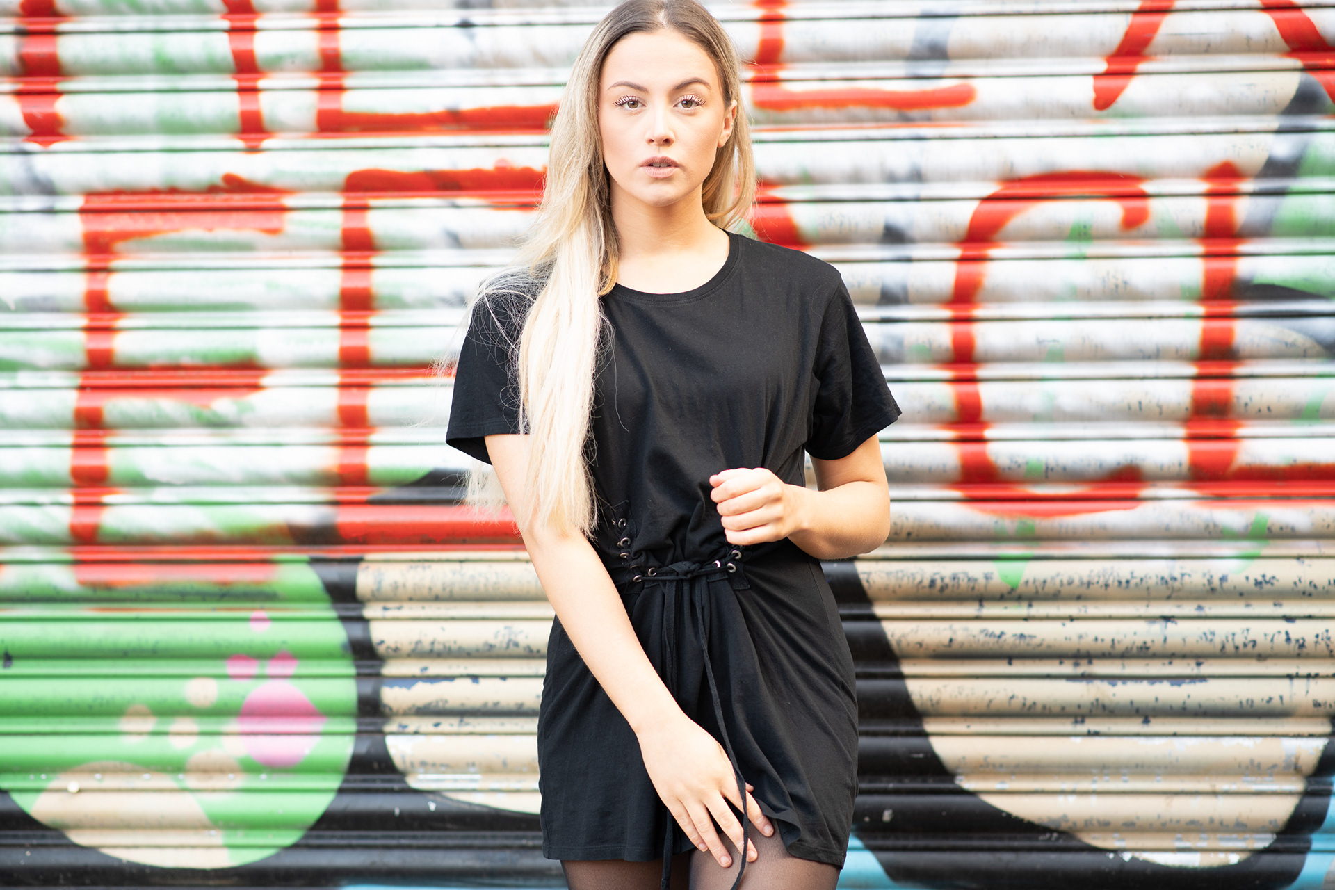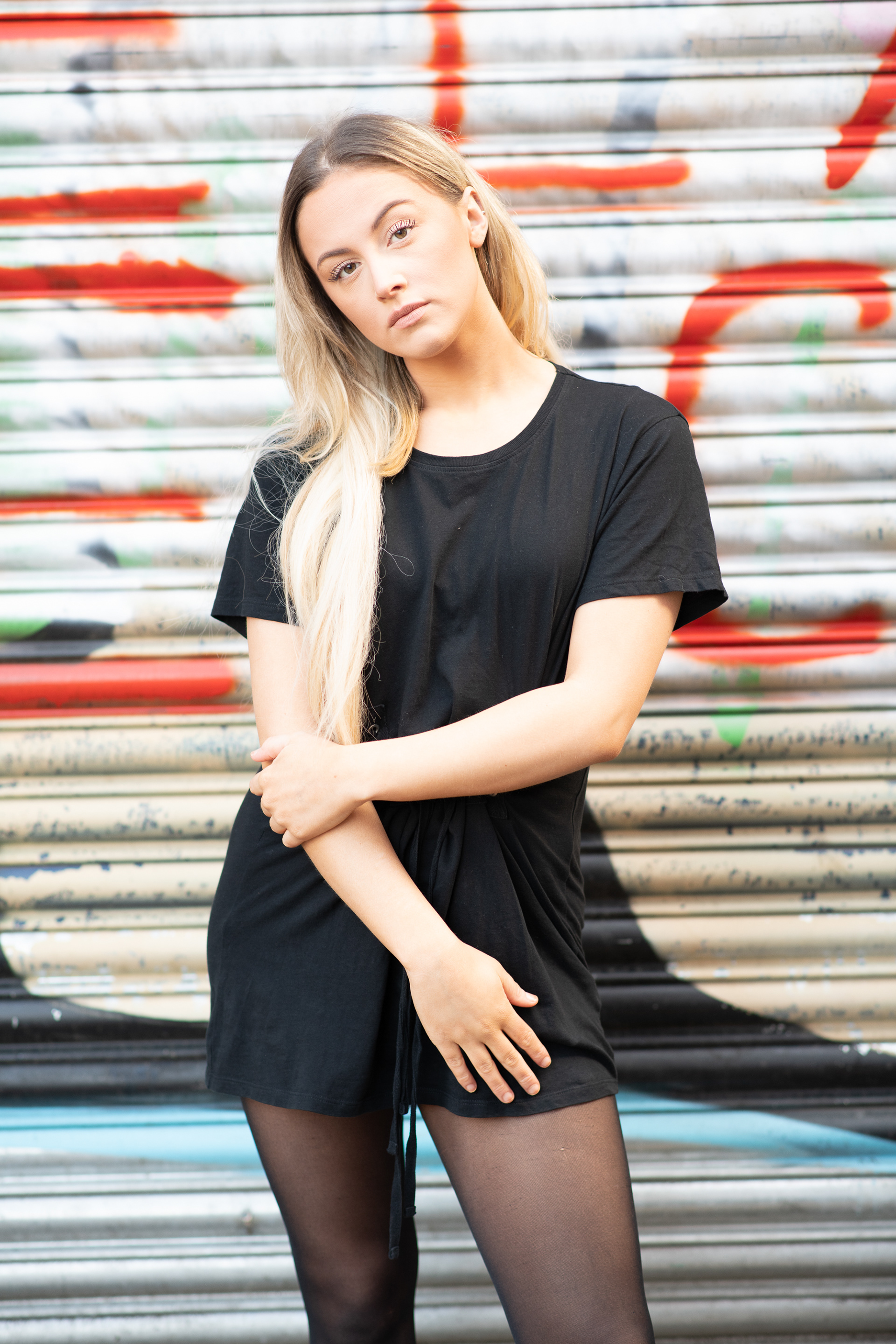 Street portraits with Victoria with the graffitied walls of Leicester Cultural Quarters as the background