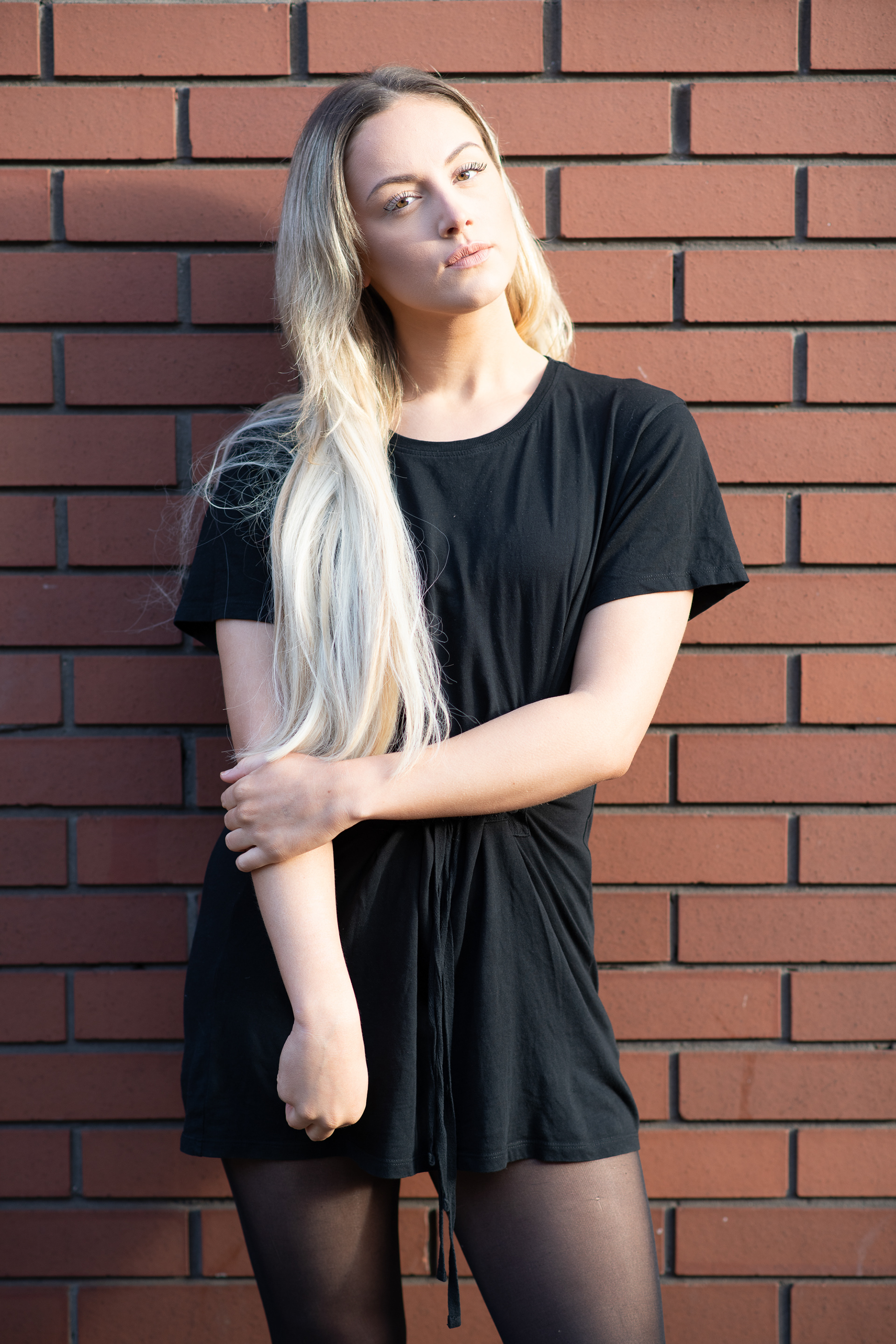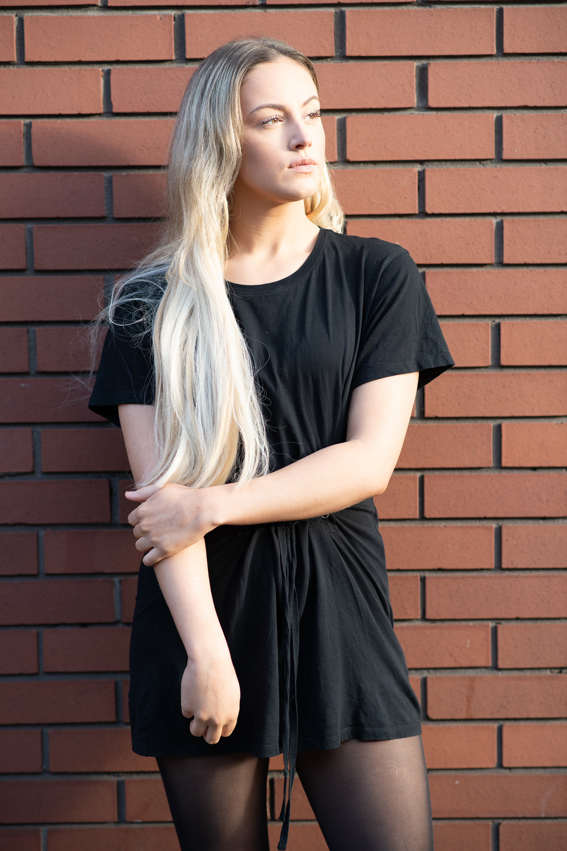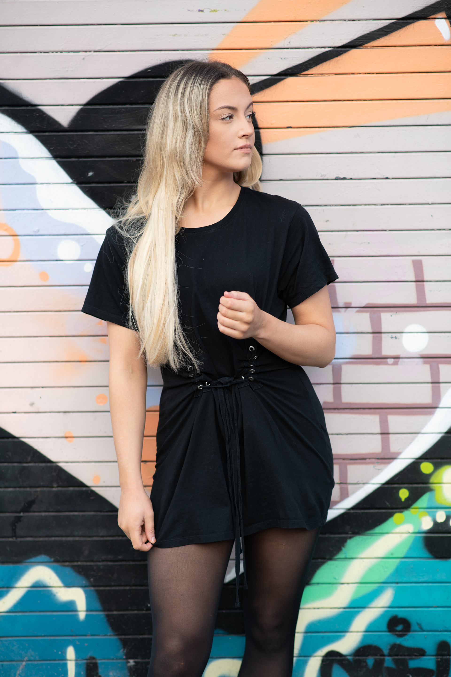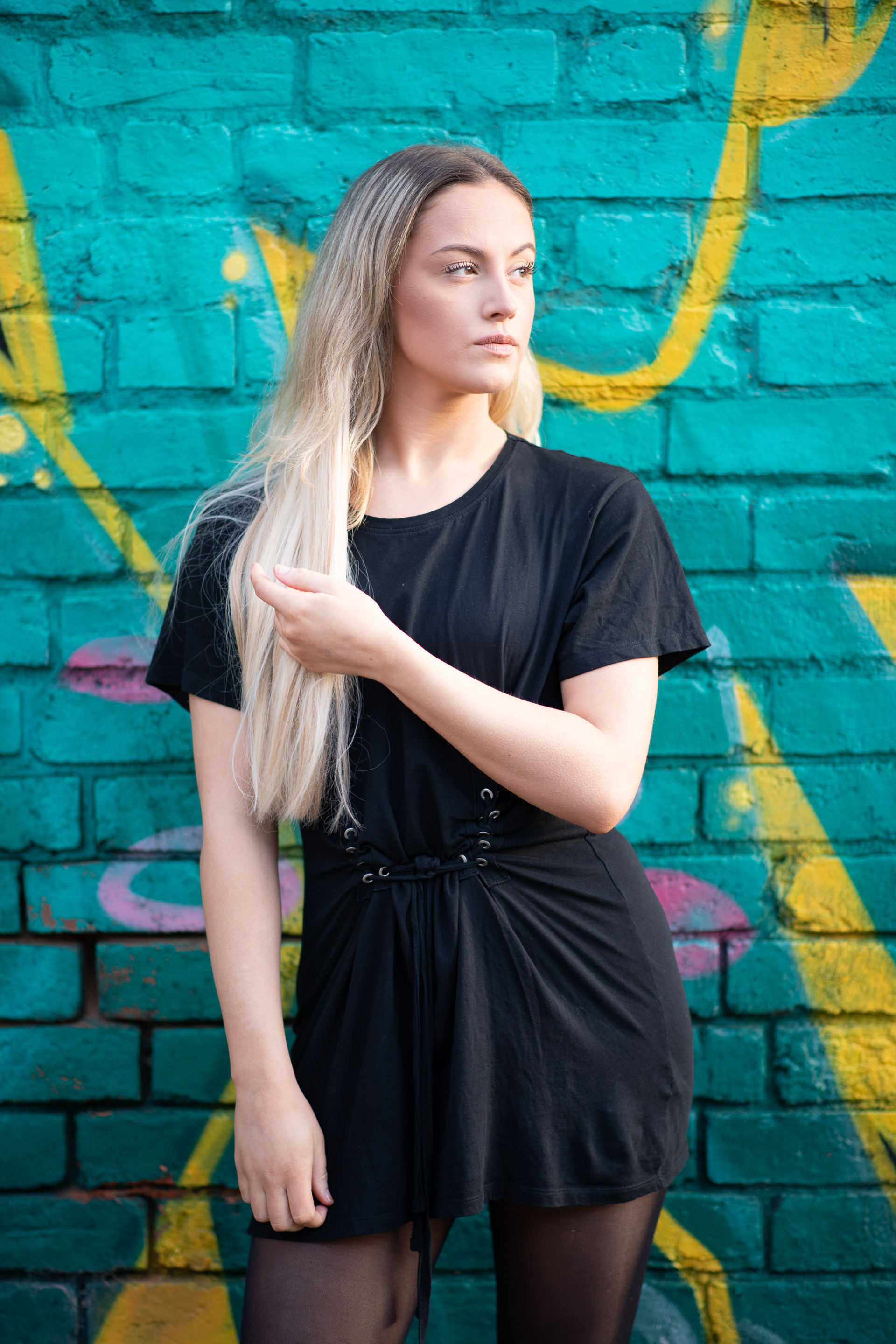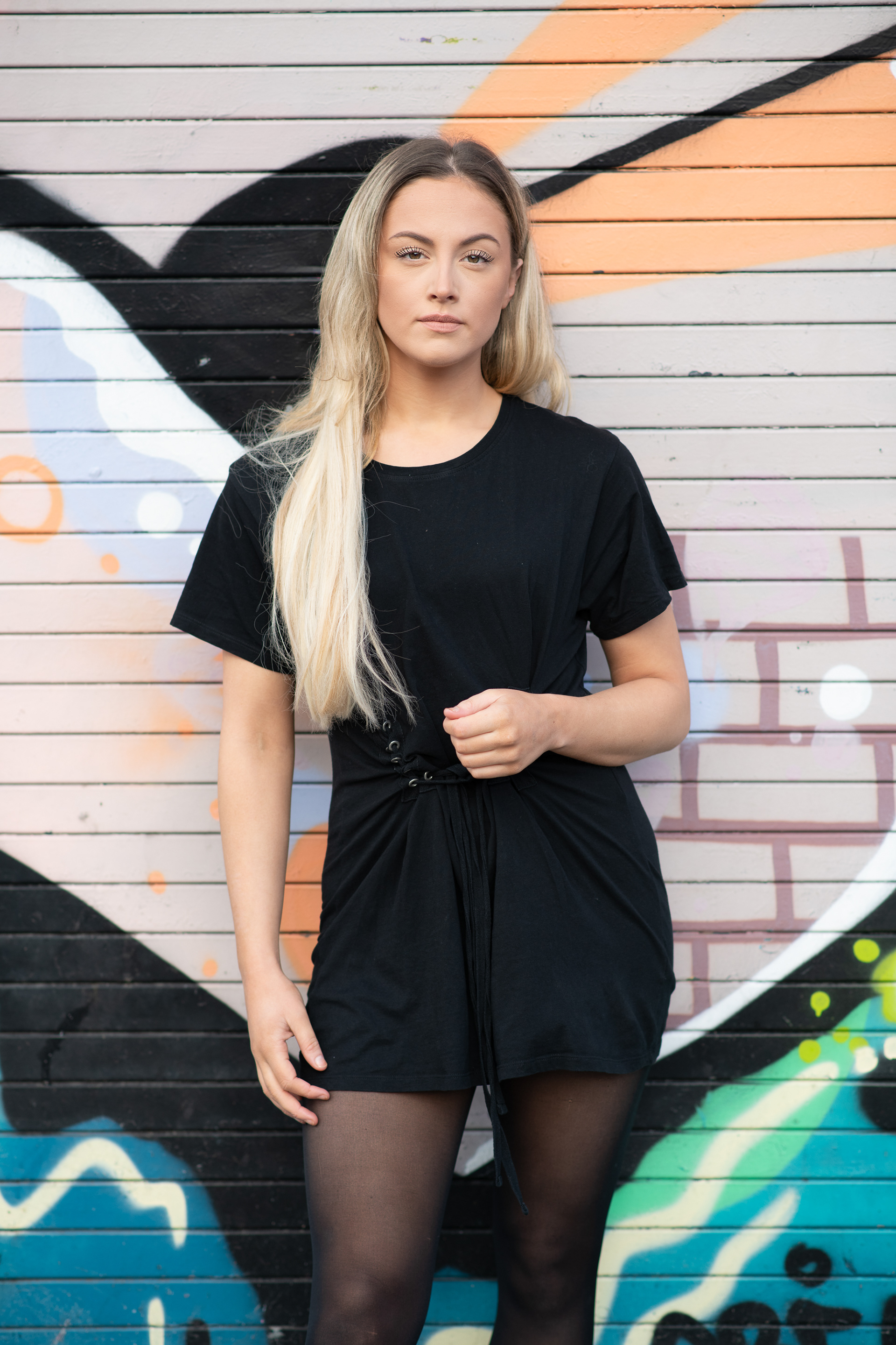 Street portraits with Victoria with the graffitied walls of Leicester Cultural Quarters as the background