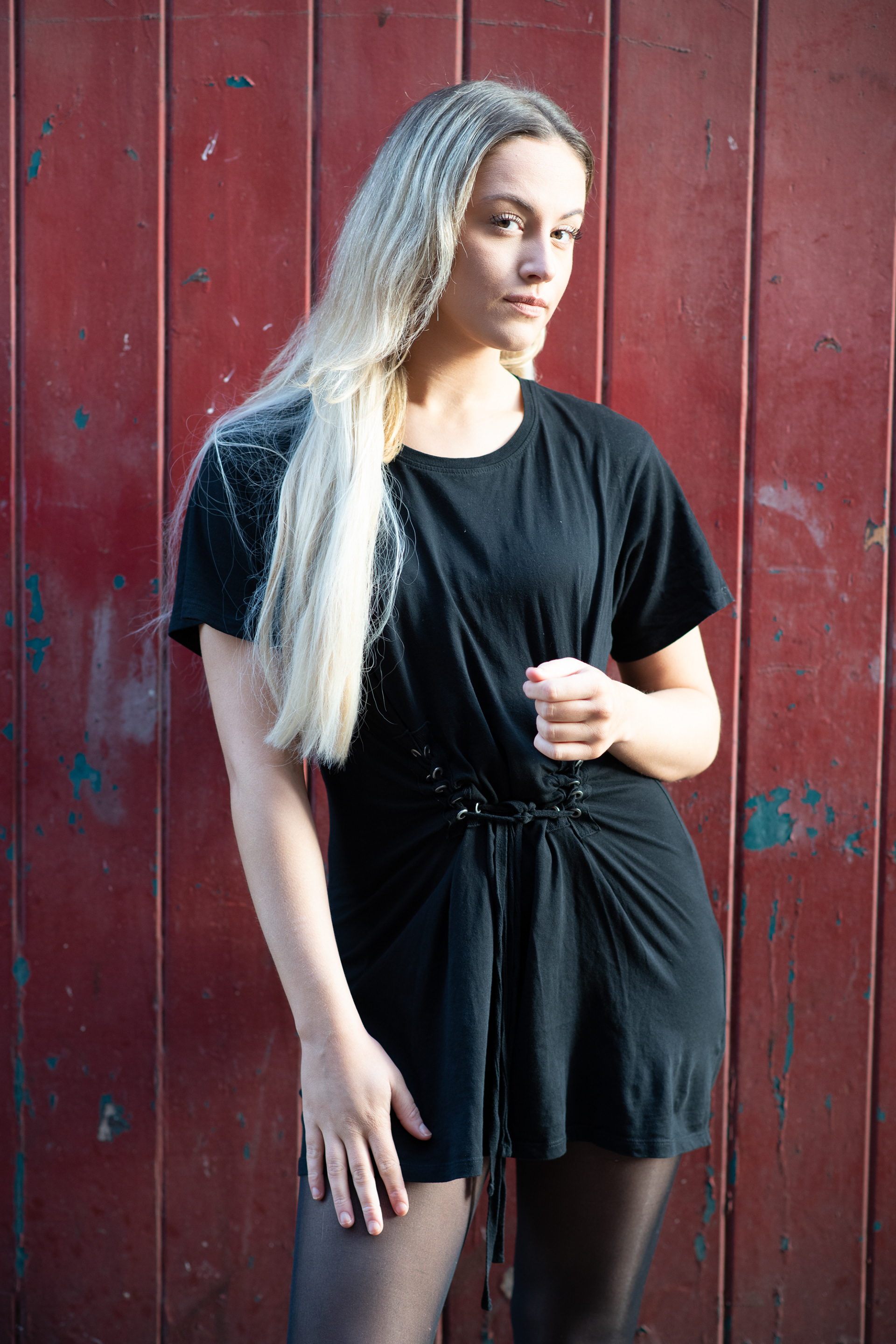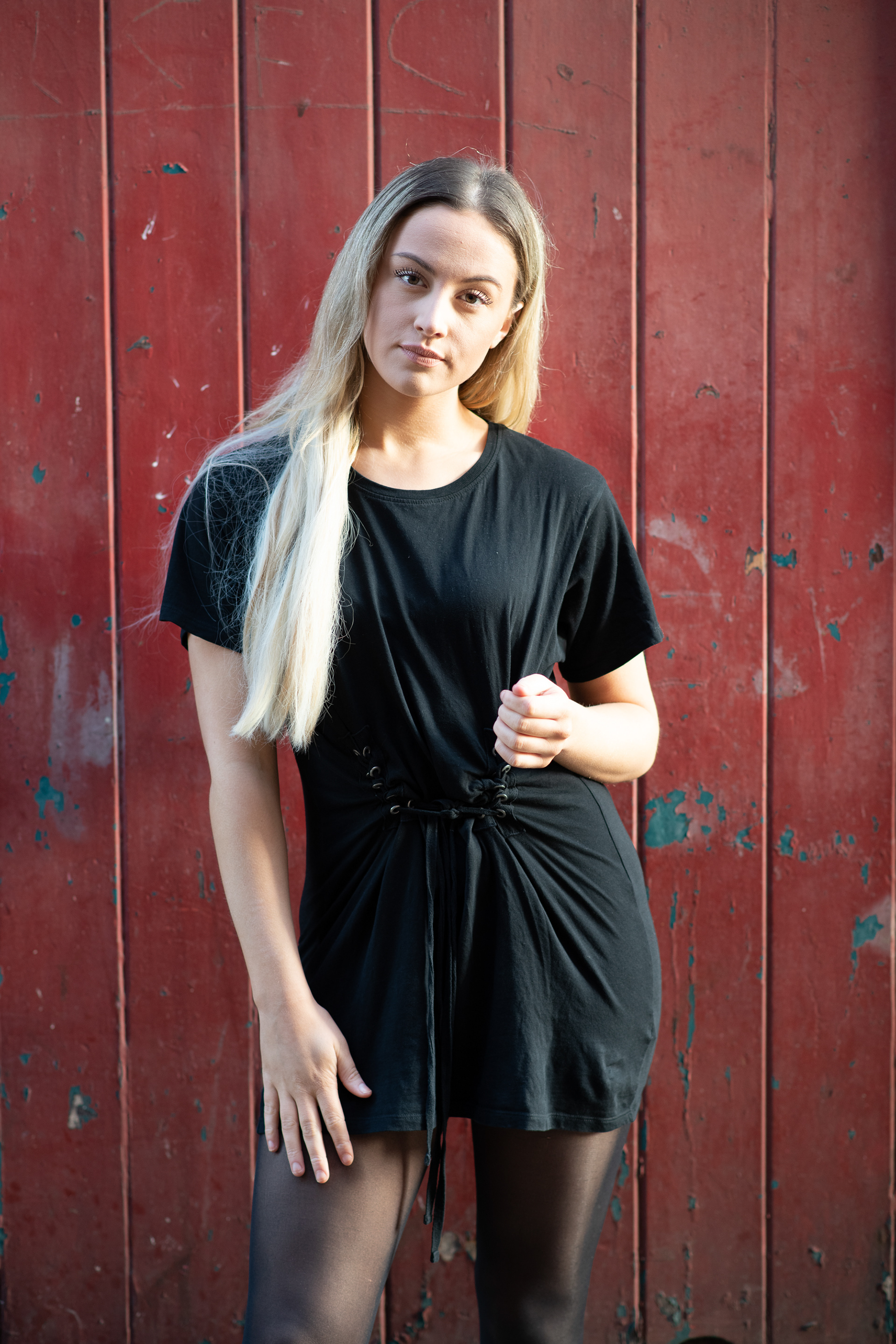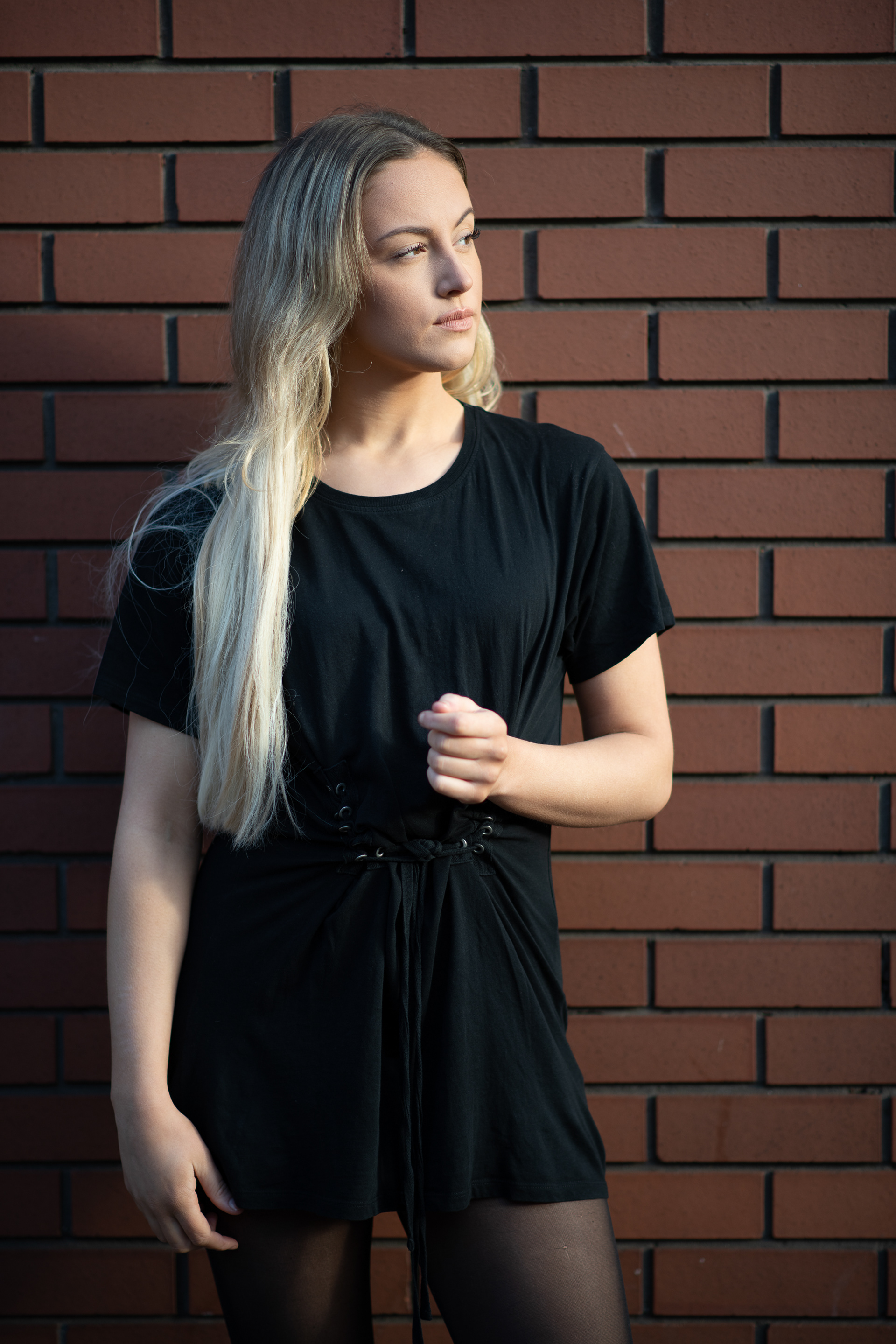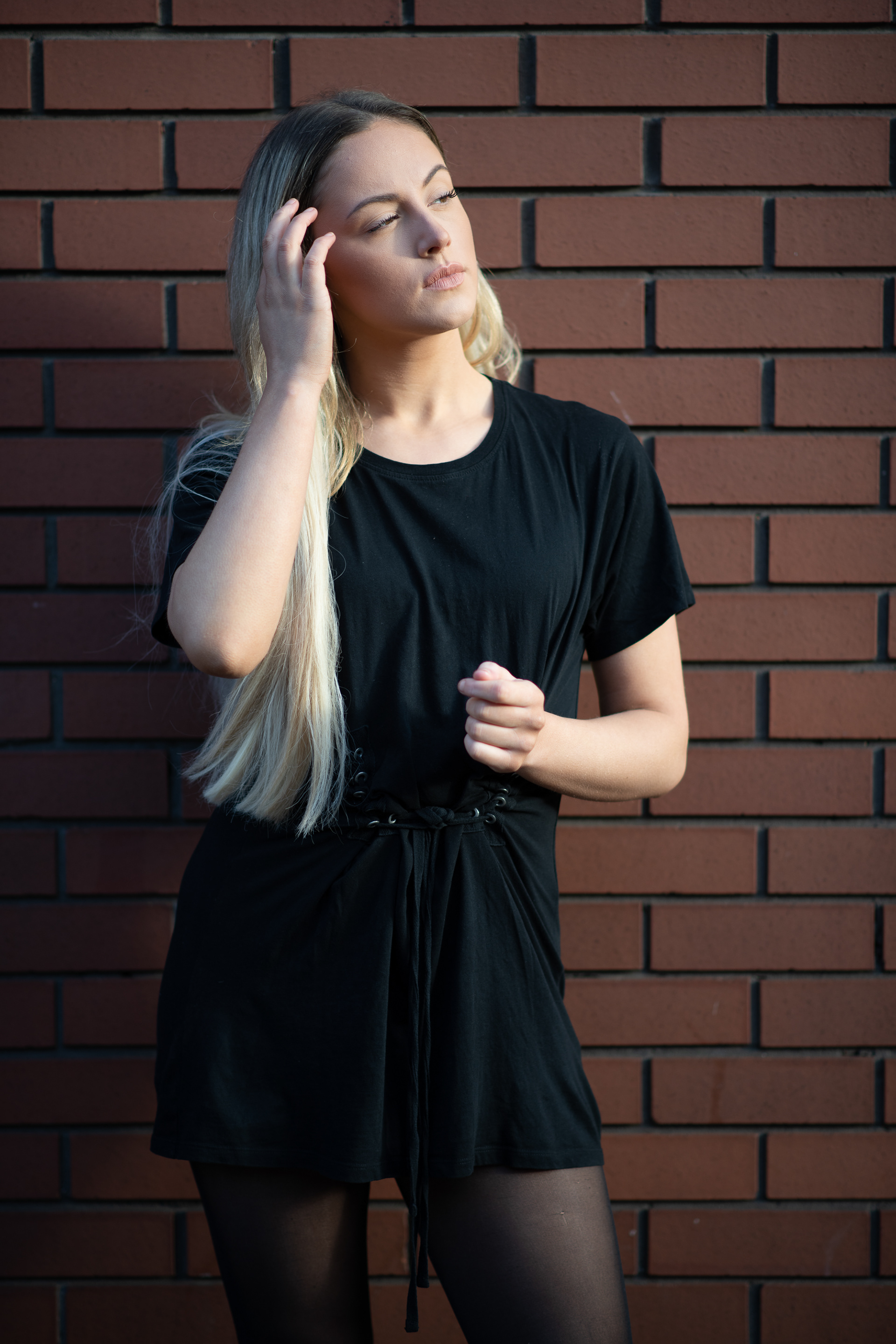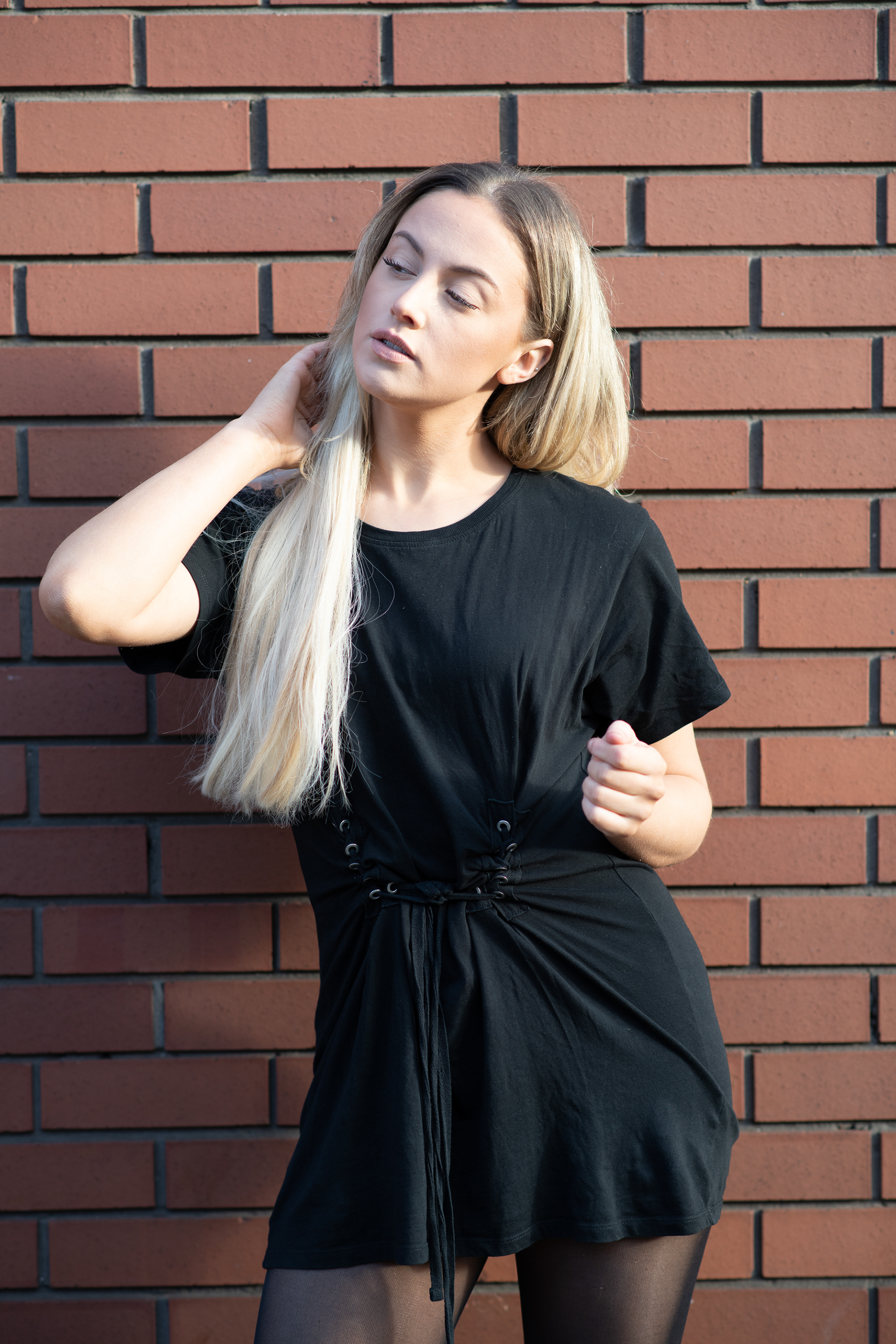 Street portraits with Victoria with the graffitied walls of Leicester Cultural Quarters as the background